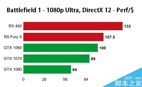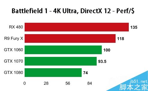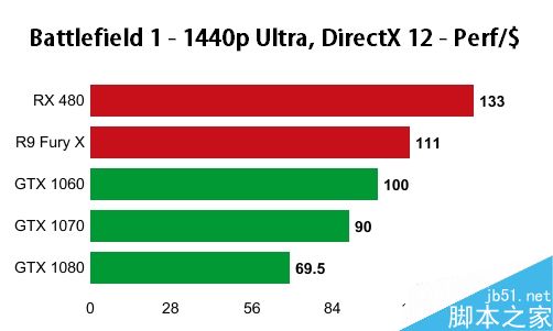 如果以每1美元能取得的性能来看,在三种分辨率下,RX 480都高居榜首,其次是Fury X,然后才轮到106/1070/1080三兄弟。