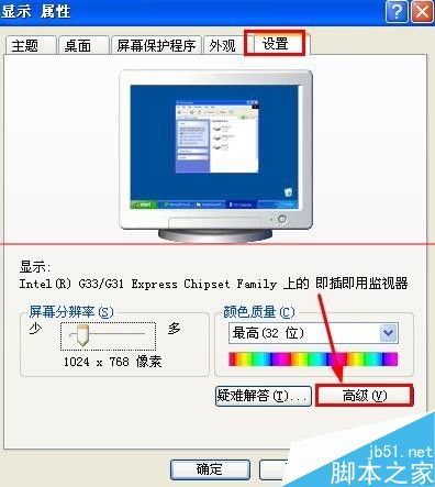 2、显示属性对话框中我们点击选择设置中的高级打开。