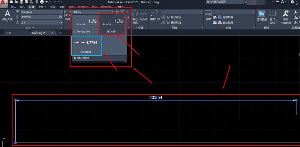 8、选中已编辑好的注释,选择“标注”的类型由“ISO-25”改成“Standard”,如下图