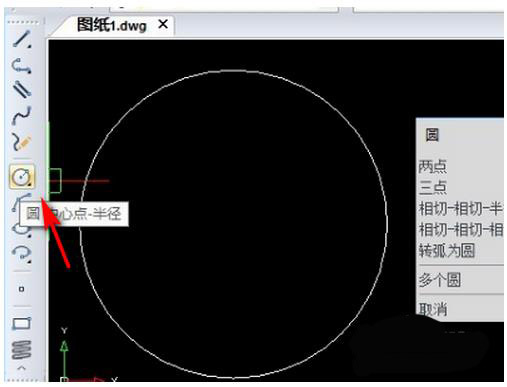 1、打开软件在左侧各种绘图选项里选择圆形图标,在CAD绘制框里绘制一个给定中心点和半径的圆。