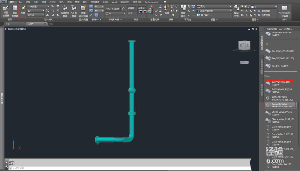 3、我们简单画一个管道,来作为示例!我们画了一段管道加了一个球阀和一个蝶阀。