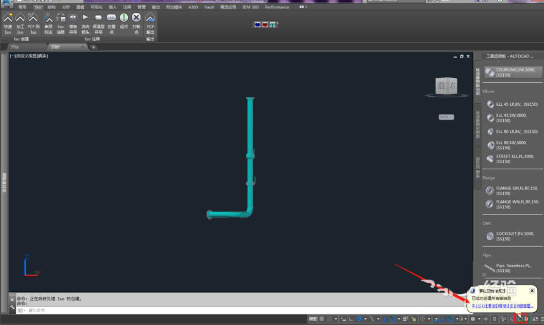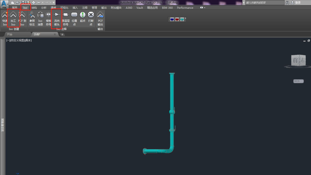 5、点击ISO菜单栏,然后点击加工ISO,当然我们也可以给管道指定流向箭头。