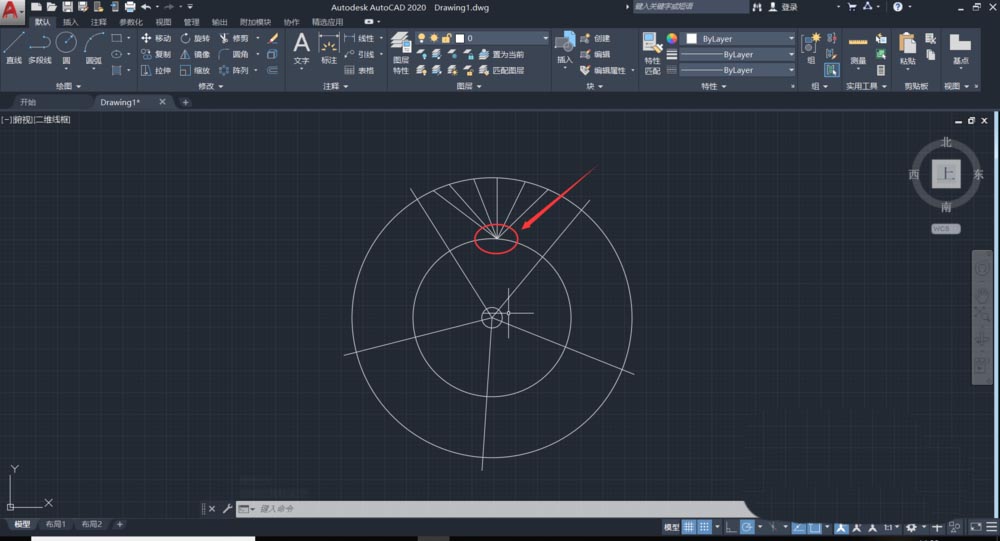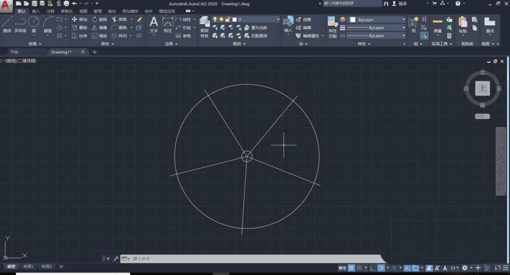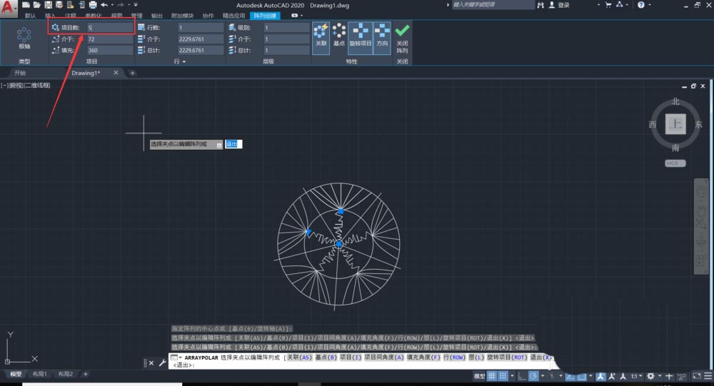2、使用直线命令,以圆心为起点画一条直线,在使用环形阵列将该直线以圆心为基点阵列5个,以此直线来限制桂花花瓣的绘制范围。
