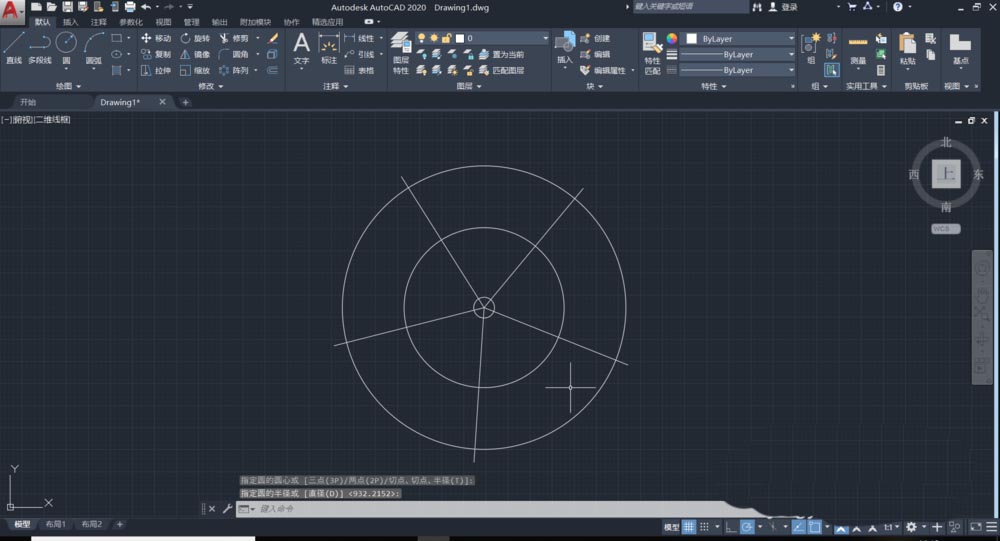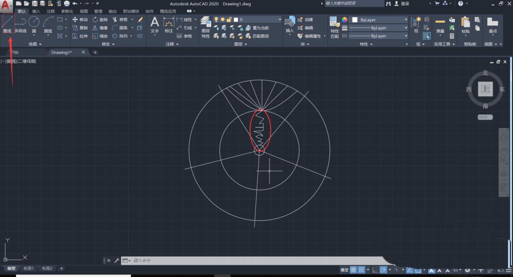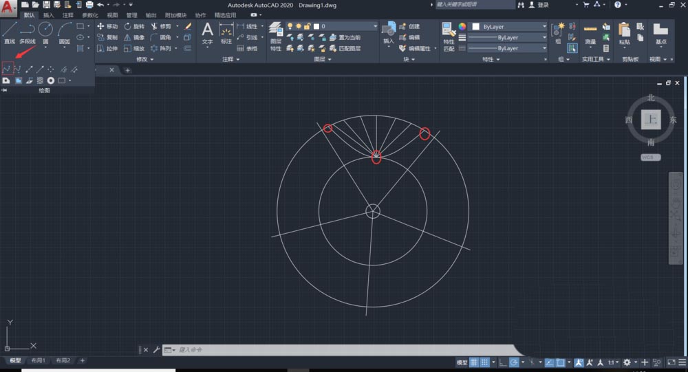 4、以中间圆为起点,使用直线命令,随机绘制6条直线,终点落在外圆上。