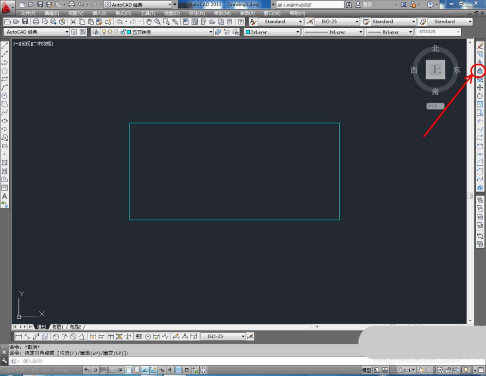 3、点击右边工具栏中的【偏移】,在命令栏中输入: 30,对矩形图案进行向内偏移 。点击【直线工具】在图示位置绘制一条直线线段(如图所示);