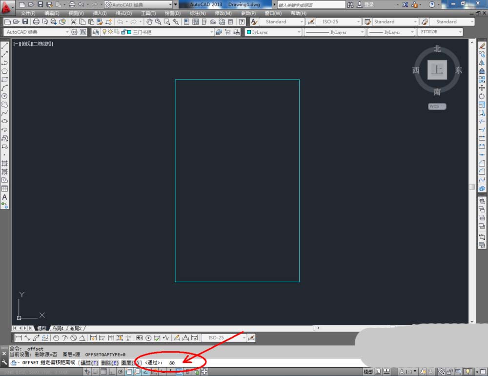 3、点击右边工具栏中的【偏移工具】,在命令栏输入偏移数值:80后,对图案底边进行向上偏移。同样的步骤,完成顶边的向上偏移后,调整好左右两条边线上的控制点(如图所示);