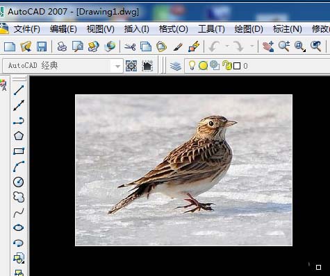 3、返回绘图界面,点击菜单栏中的“插入”按钮,从下拉中菜单选择“插入光栅图像参照”将电脑桌面上鸟图插入到屏幕上。