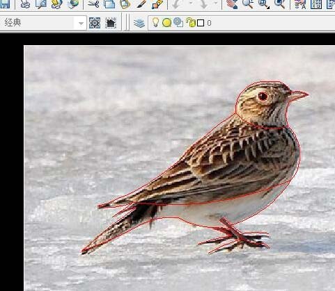4、滚动鼠标滑轮将图像放大,然后在菜单栏中点击“绘图”按钮,选择“圆弧”子菜单下的“起点、端点、方向”,对鸟的外轮廓及内部进行勾勒。