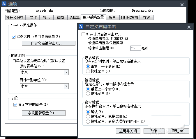 2、修改右键单击模式在编辑区右击,点选“选项”,进入“选项”设置界面。点选用户系统配置,点击“自定义右键单击”,设置单击右键的执行:在默认模式与编辑模式下为重复上一个命令,在命令模式下为确认。完成后点击应用并退出。修改后可以大大提高绘图速度。