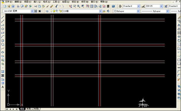 7、点选修改--复制,或直接利用复制命令,将墙线复制到每一个轴线处,然后关掉轴线层。