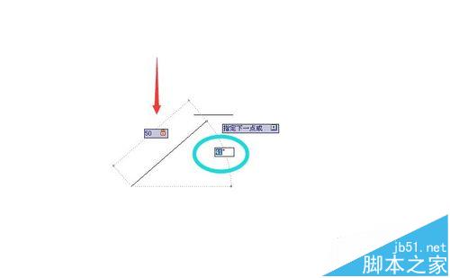 3、在键盘中直接输入管段的距离,比方50回车后,管线就是50M。然后按【TAB】键,就会跳到输入角度框,这个就是要确定直线的方向和角度,比方输入30,就是代表直线水平向上30°角。