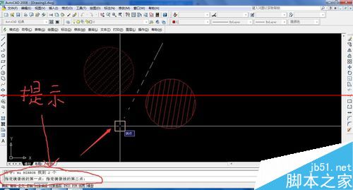 4、接着就是选择镜像的对称轴第一点的位置,这就是我们之前画好的那条直线,选中斜线的一个端点点击鼠标左键