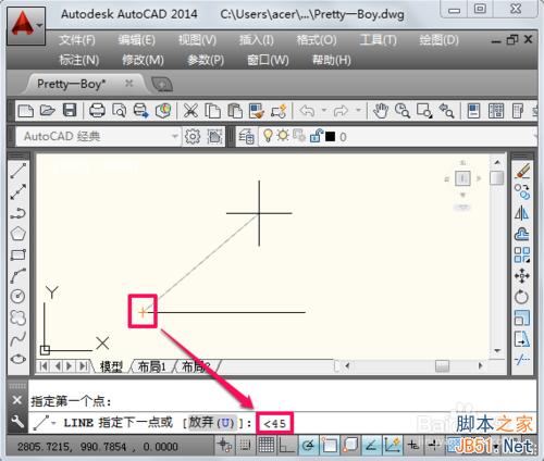 我们先画出一条水平直线做参照,然后使用直线工具点击第一点,在命令行中输入“<45”(限定为45度的意思),最后按回车键确定。