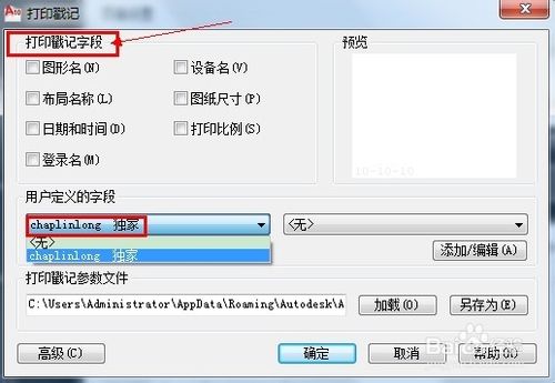 6、这一步很关键。这时,你就需要点击用户自定义字段下面右边的三角符号,选中你刚才添加的字。当然,至于上面的打印戳记字段要根据个人需要选择了。