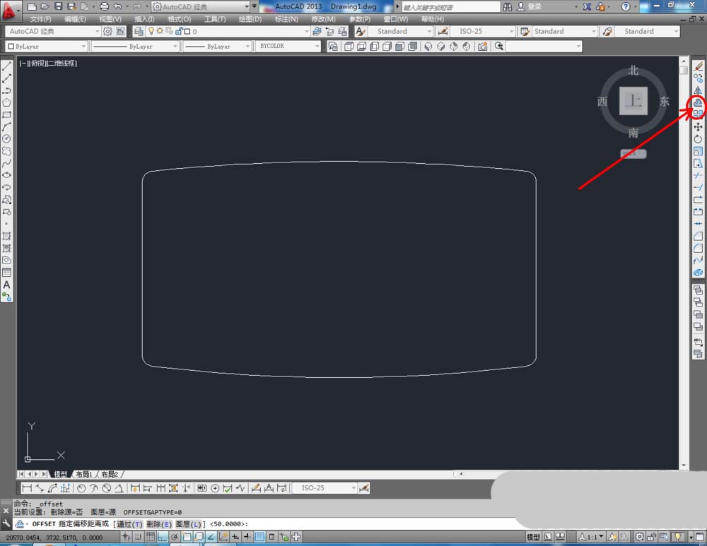 1、打开AutoCAD2013软件,点击【直线工具】,在作图区域绘制一个1750*860mm的矩形图案。点击【圆弧工具】,按图示绘制出一条弧线后,点击【镜像工具】,绘制出对称的另外一条弧线(如图所示);