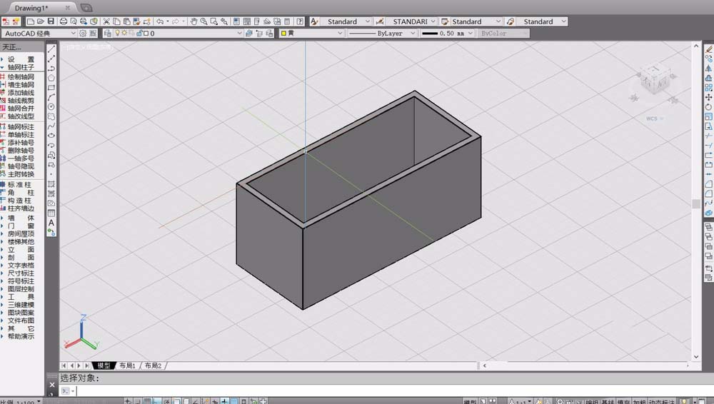 1、首先我们开启AutoCad,进入到三维模型的建模页面,简单的利用拉伸命令,就会获得完全的体块,不能够体现空间。