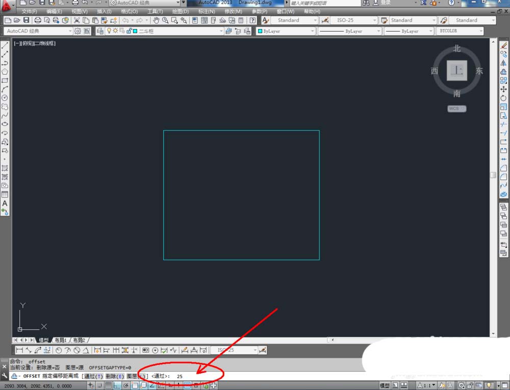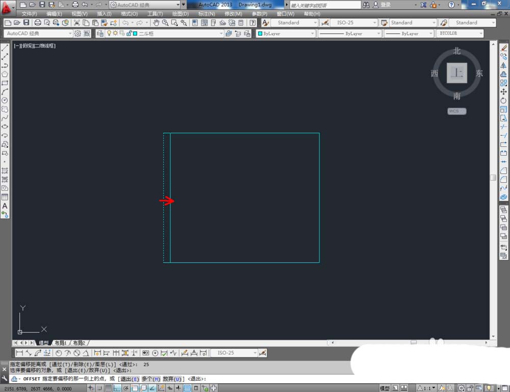 3、点击右边工具栏中的【偏移工具】,在命令栏输入偏移数值:25后,对左右两边以及顶边进行向内偏移操作。在命令栏输入偏移数值:80后,对图案底边进行向上偏移。完成后按图示调整好偏移线条上的节点(如图所示);