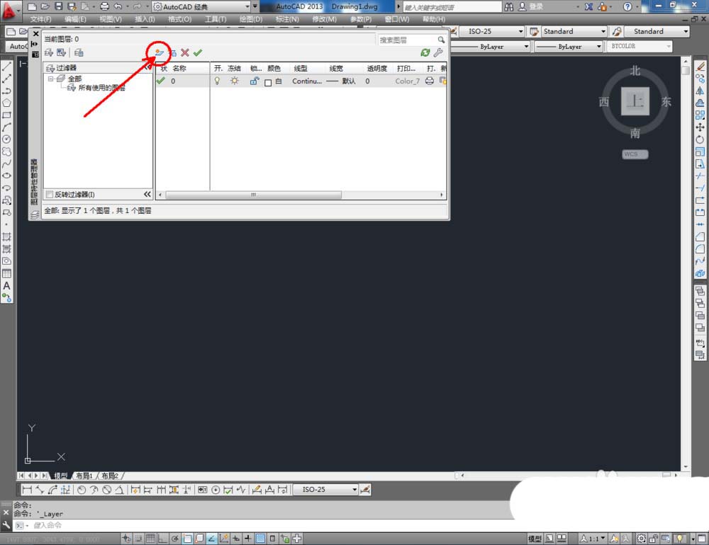 1、打开AutoCAD 2013软件,点击【图层特性管理器】,点击【新建图层】,将图层命名为:四门展柜。点击色块,按图示设置一个图层颜色,完成四门展柜图层的设置(如图所示);