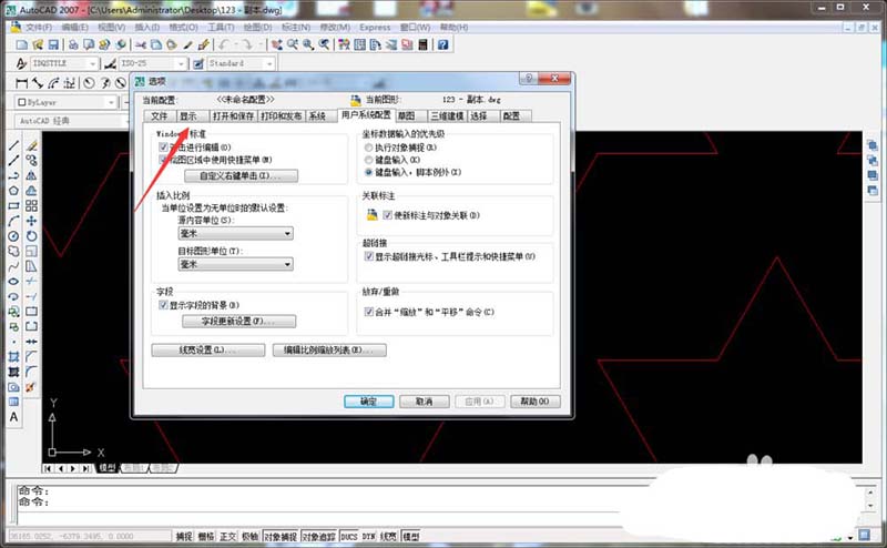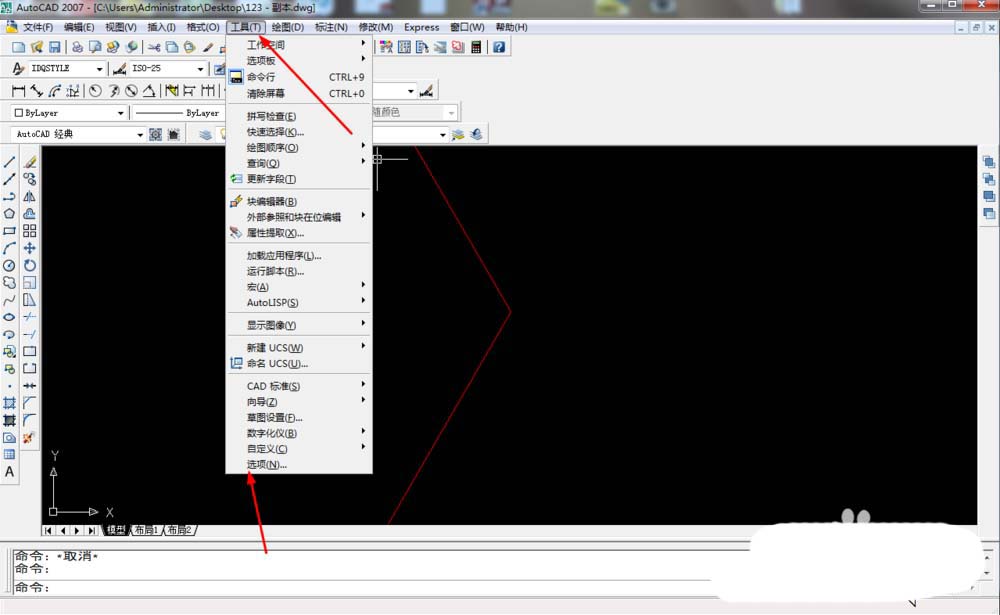 2、随后在AUTOCAD中点击工具后我们点击选项按钮,如图所示;