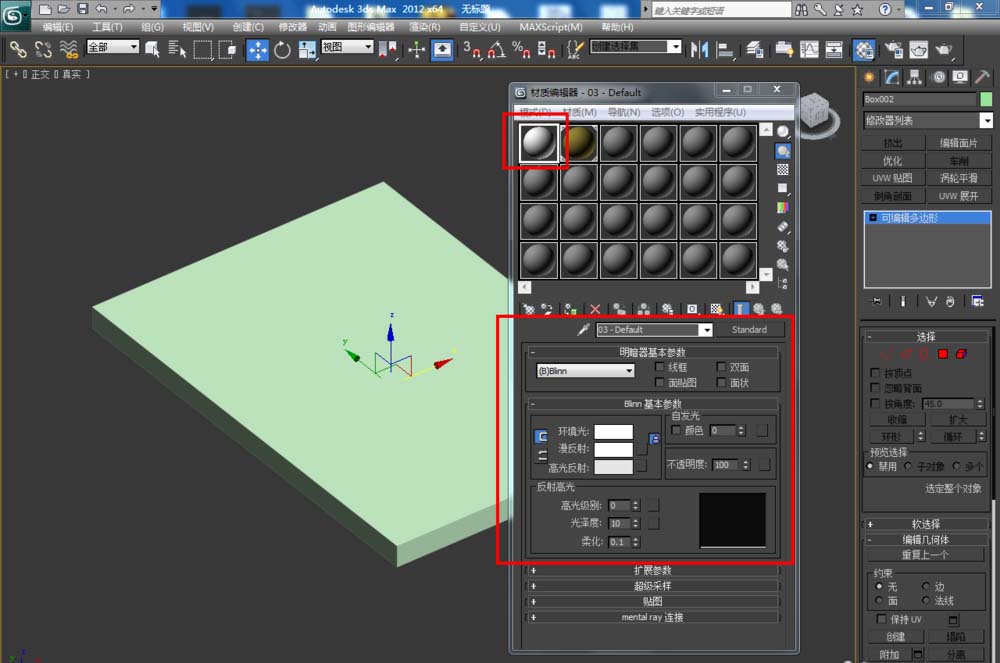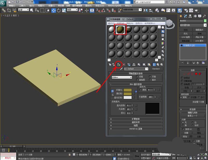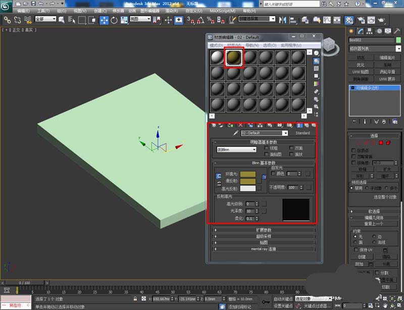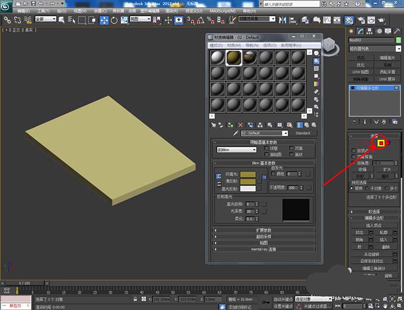 3、选中模型,将墨绿色材质球附加给模型后,点击右边工作区中的【面】图标,按图示对选面进行材质附加(如图所示);