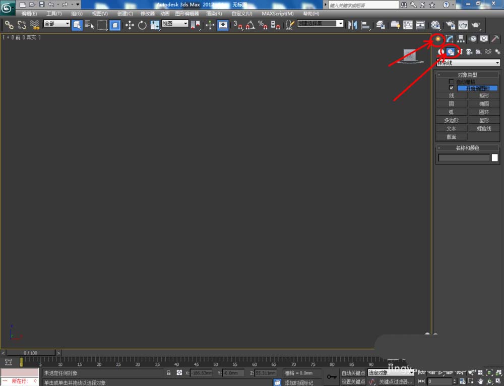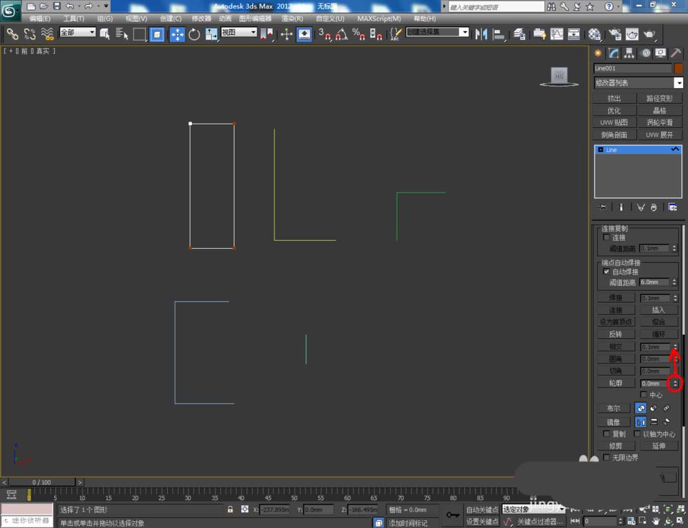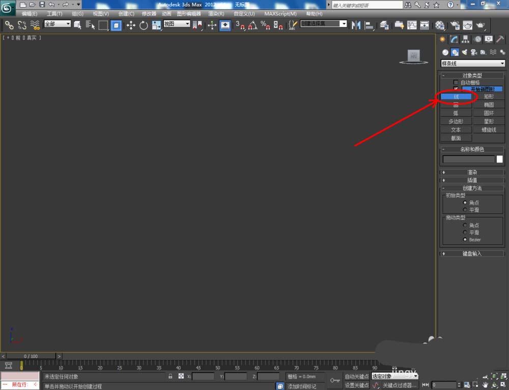 1、打开3Dmax2012软件,点击【创建】-【图形】-【线】,按图示在作图区域绘制多个线段图案(如图所示);