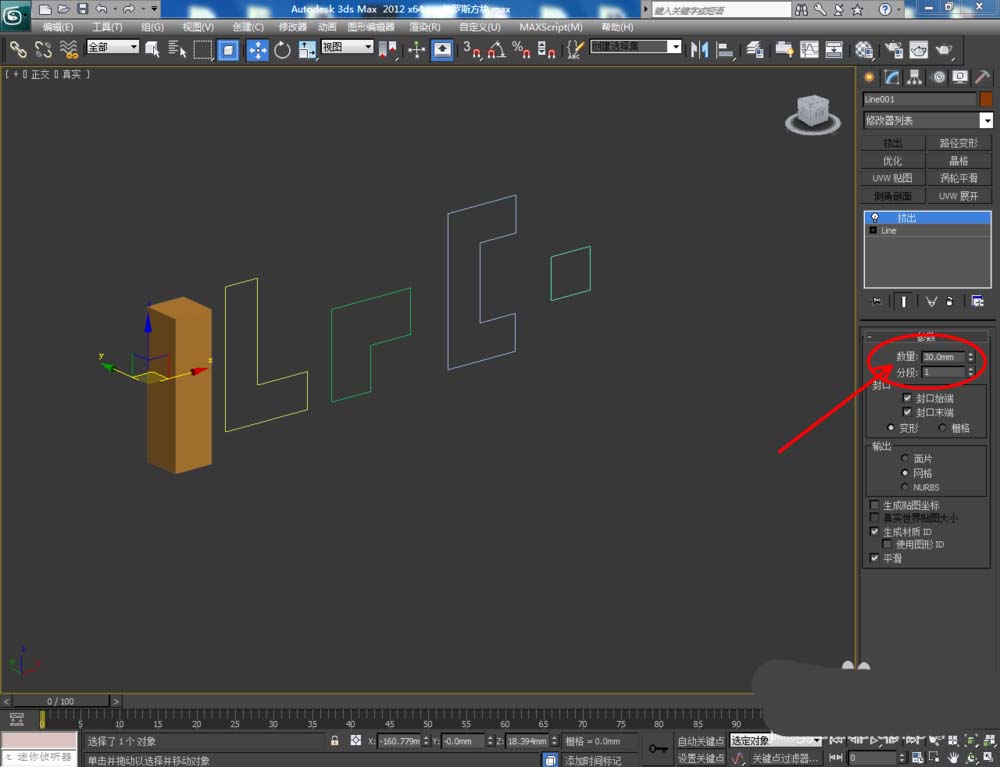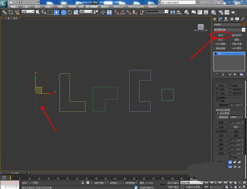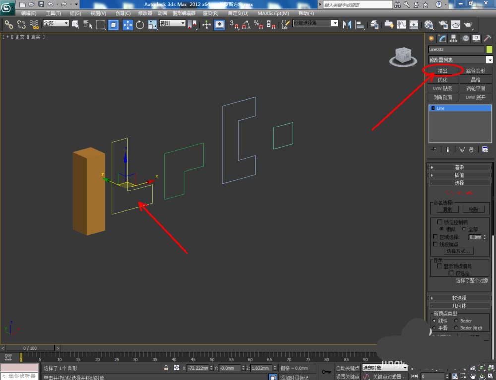 3、选中第一个图案,点击【修改】-【挤出】,按图示设置好挤出的各个参数,完成第一个积木模型的制作。同样的步骤,完成另外几个图案的挤出操作(如图所示);