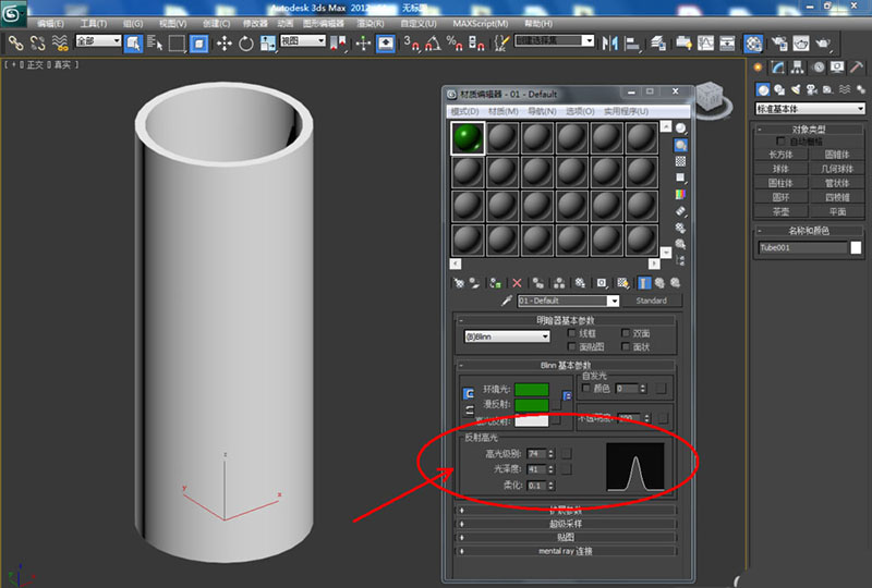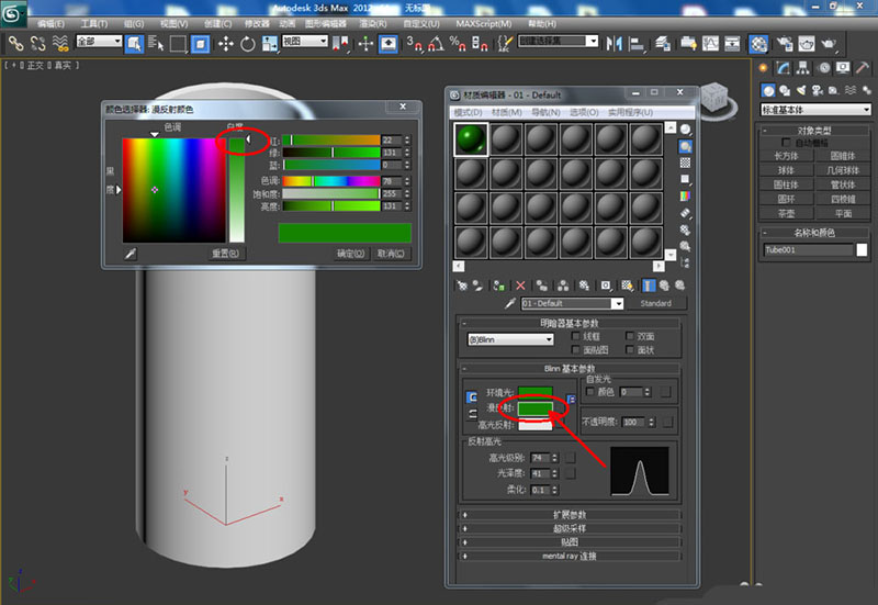 2、点击【材质编辑器】弹出材质编辑器设置栏,按图示设置一个绿色光面材质球并将材质球附加给管状体模型,这样我们通过软件自带管状体工具制作的管状体模型就完成了;