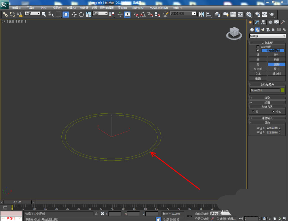 3、点击【创建】-【图形】-【圆环】,按图示在作图区域绘制一个圆环图案并按图示设置好圆环的各个参数。选中图案,点击【对象颜色】将模型的对象颜色设置为:白色(如图所示);