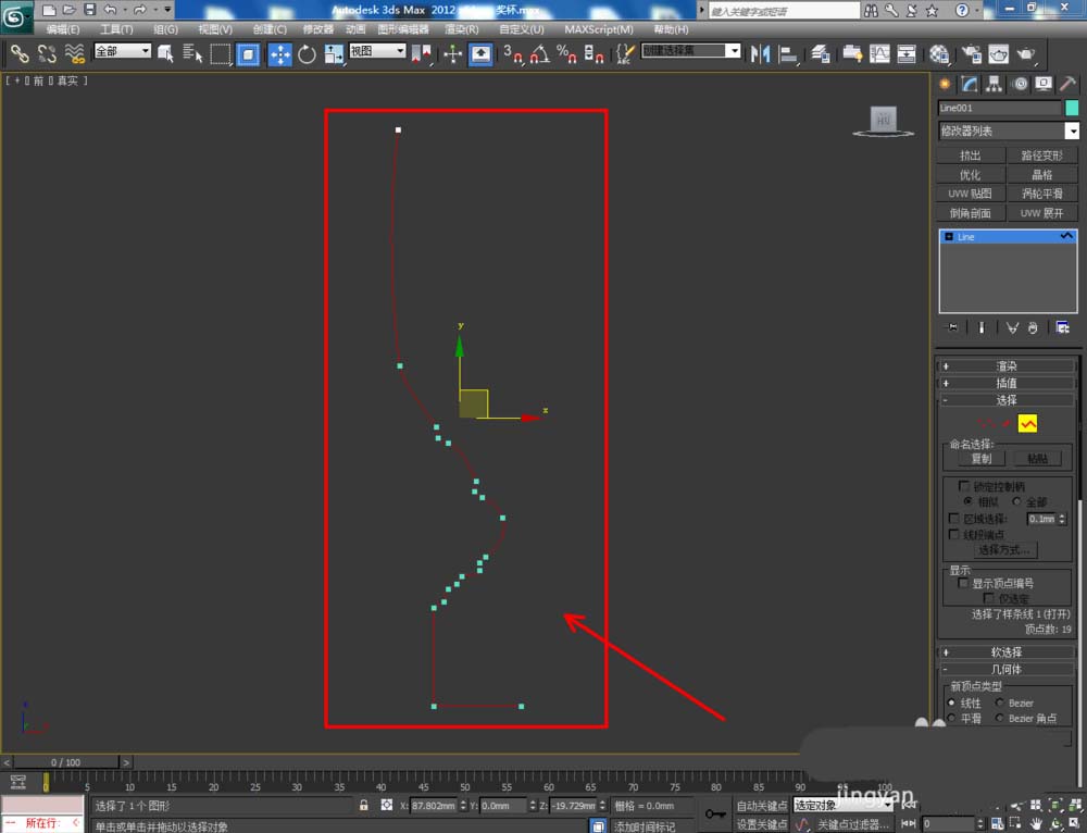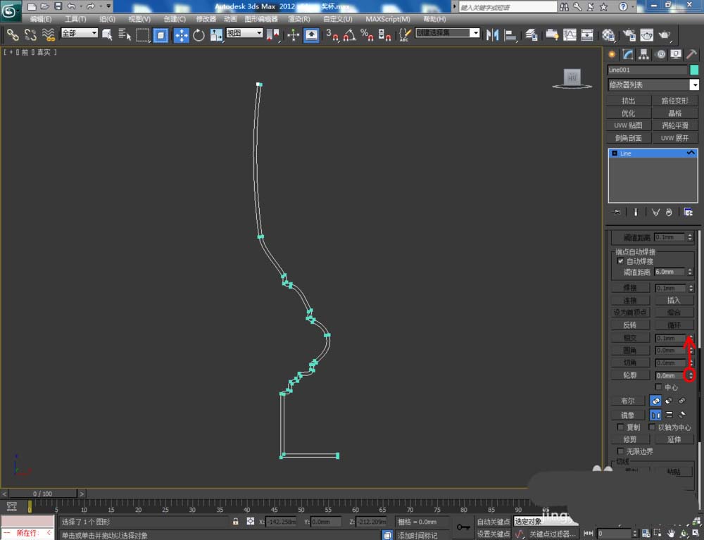 3、点击右边工作区中的样条线,选中整个线条图案上的样条线后,鼠标向上拉动【轮廓】右边的小三角,对线条图案进行轮廓处理,完成奖杯截面图案的制作(如图所示);