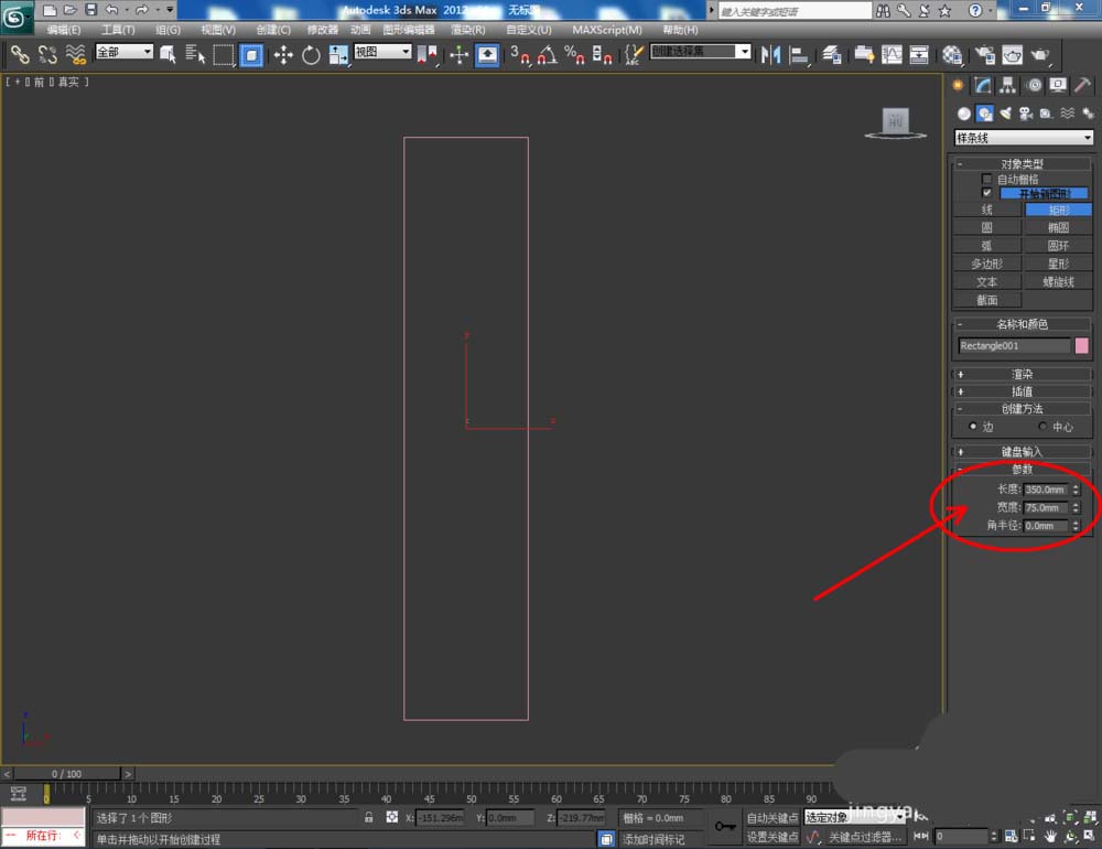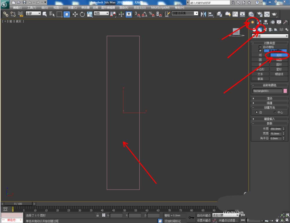 1、打开3Dmax2012软件,点击【创建】-【图形】-【矩形】,在作图区域绘制一个参考矩形图案并按图示设置好矩形图案的各个参数;