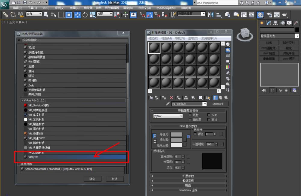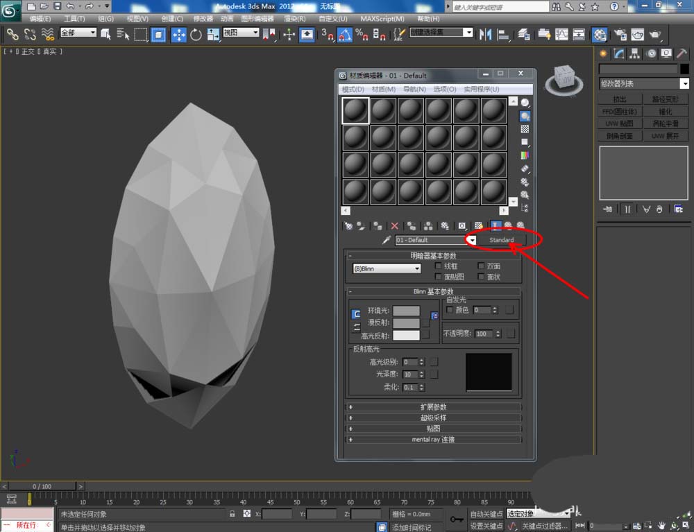 3、点击【材质编辑器】,弹出材质编辑器设置框,点击【standard】-【VAryMlt】设置一个Vary材质球,按图示设置好【反射】与【折射】中的各个参数,制作出一个橄榄石材质球。完成后将材质球附加给模型(如图所示);