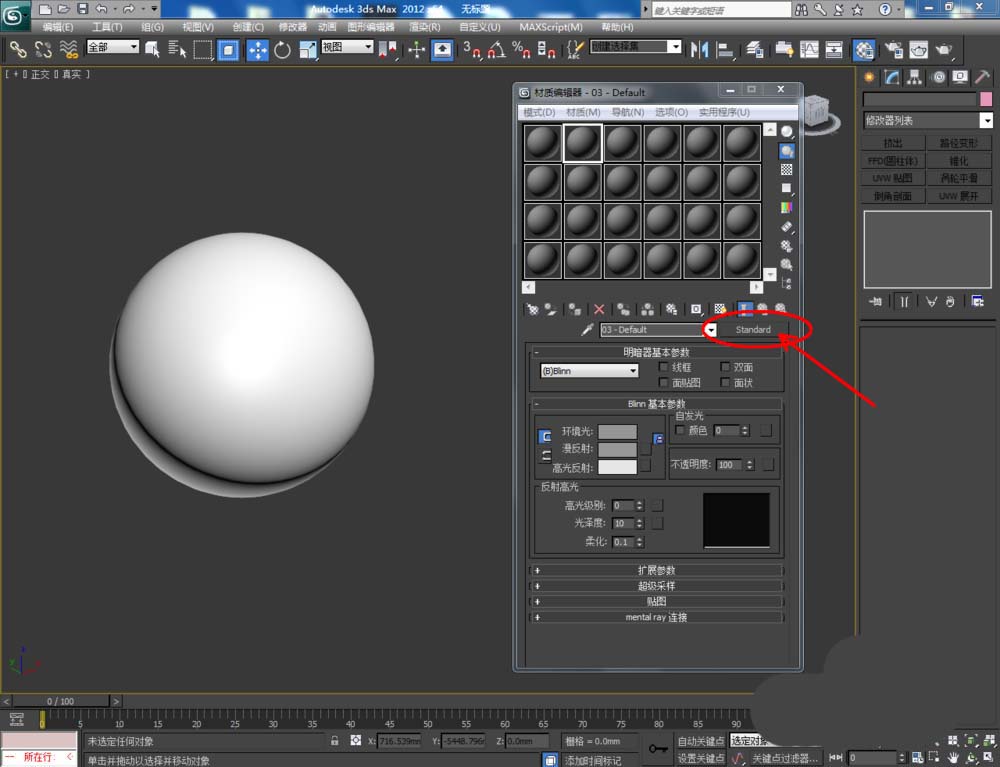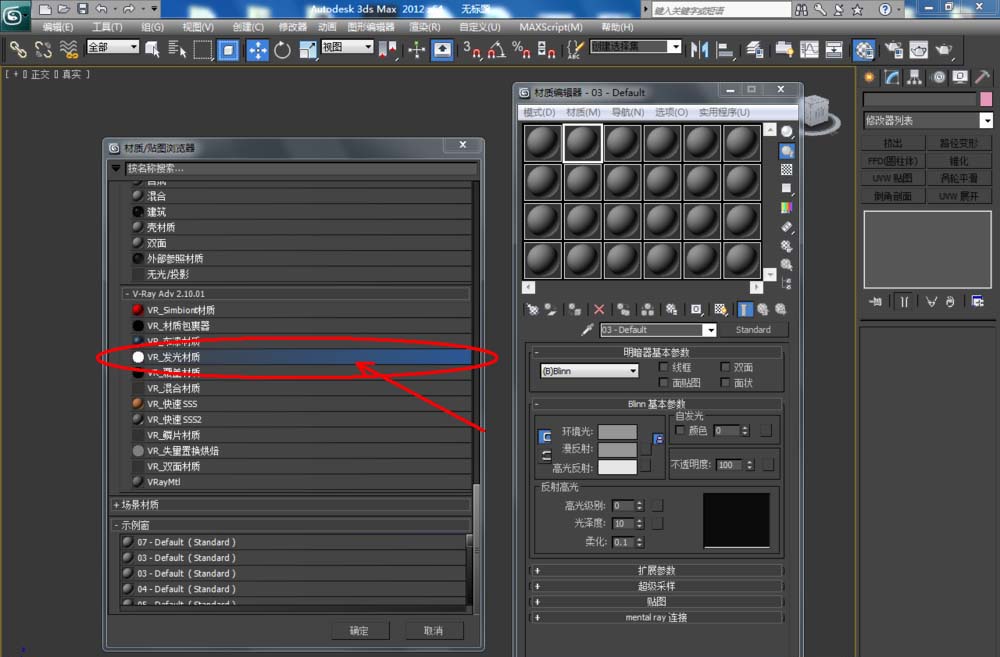 3、点击【材质编辑器】,弹出材质编辑器设置框,点击【standard】-【VR-发光材质】设置一个发光材质球(如图所示);