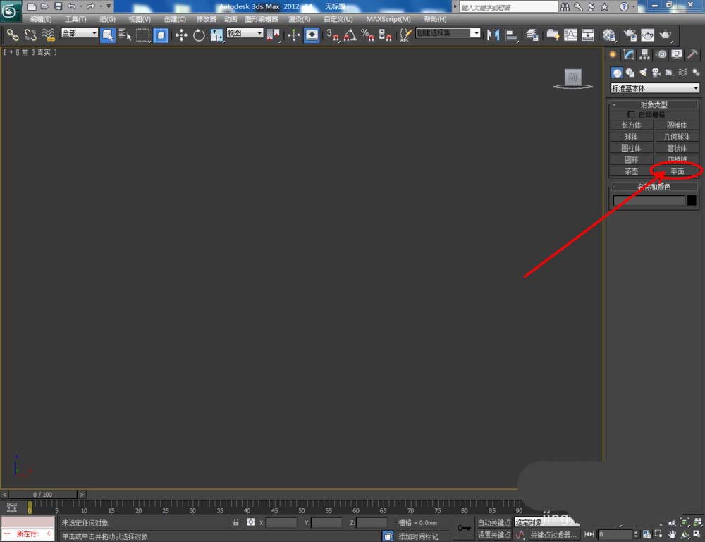 1、打开3Dmax2012软件,点击【创建】-【几何体】-【标准基本体】-【平面】,在作图区域绘制一个平面模型,并按图示设置好平面模型的各个参数;