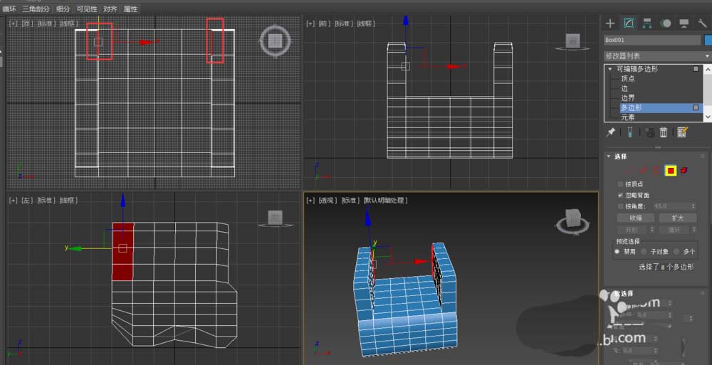 7、进入多边形层级,选择如图所示的多边形,按键盘中的delete键,将选择的多边形删除。