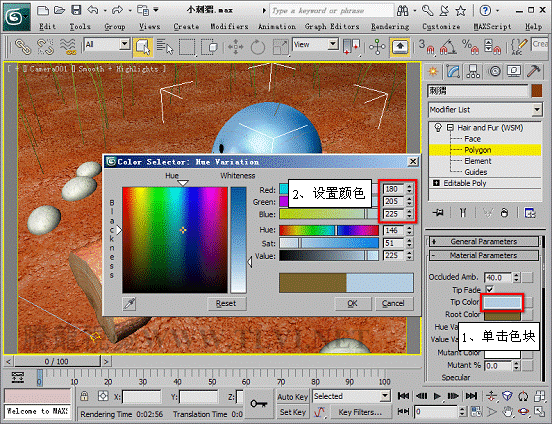 (4)观察渲染后的图像可以发现,当前毛发的数量和颜色都不正确,需要对其进行编辑,首先需要选择子对象,使毛发沿制定面生成。