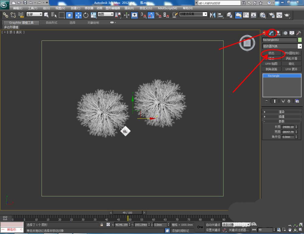 1、打开3Dmax2012软件,先绘制一个雪人模型并附好模型材质。将树的模型也合并进来,按下【shift】键,拉动复制出另外一个树模型(如图所示);