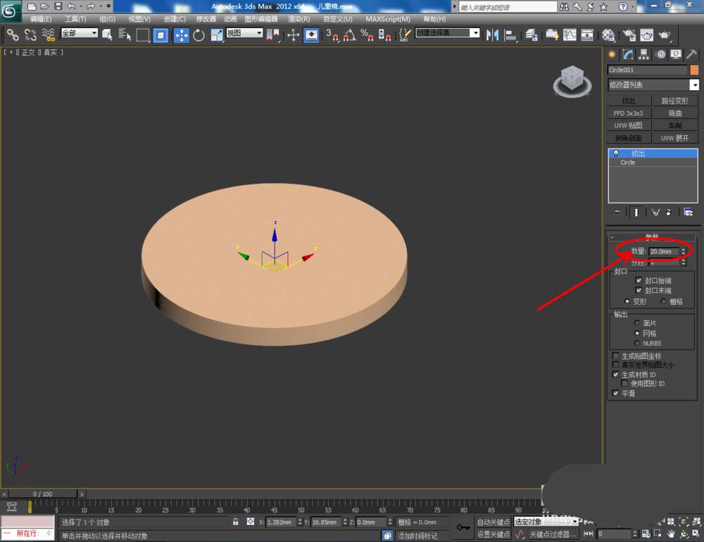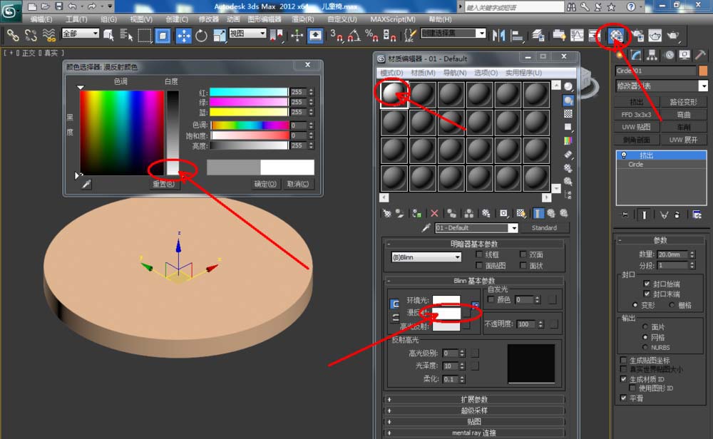 2、选中圆形图案,点击【修改】-【挤出】,按图示设置好挤出的各个参数后,点击【材质编辑器】,按图示设置一个白色材质球并附加给模型。选中模型,点击【对象颜色】将模型的对象颜色设置为:黑色;