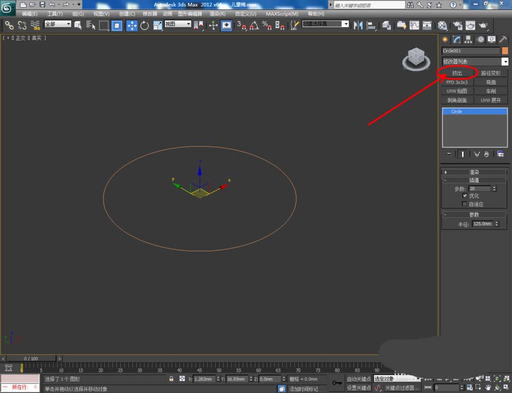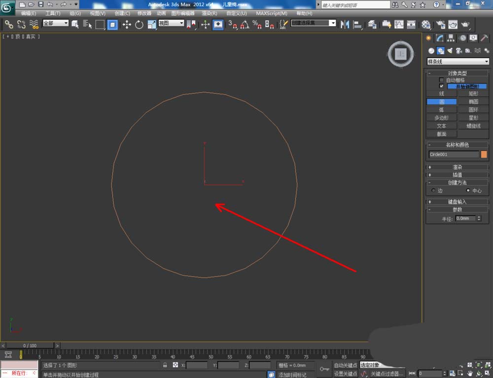 1、打开3Dmax2012软件,点击【创建】-【图形】-【圆形】,在作图区域绘制一个圆形图案并按图示设置好圆形的各个参数(如图所示);