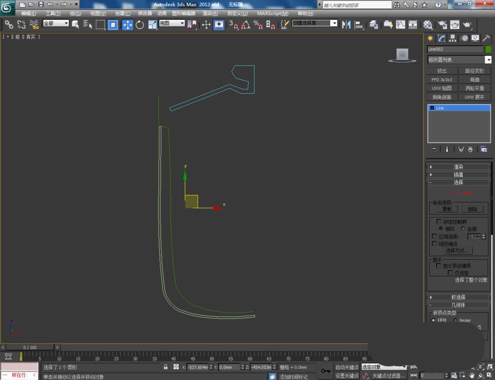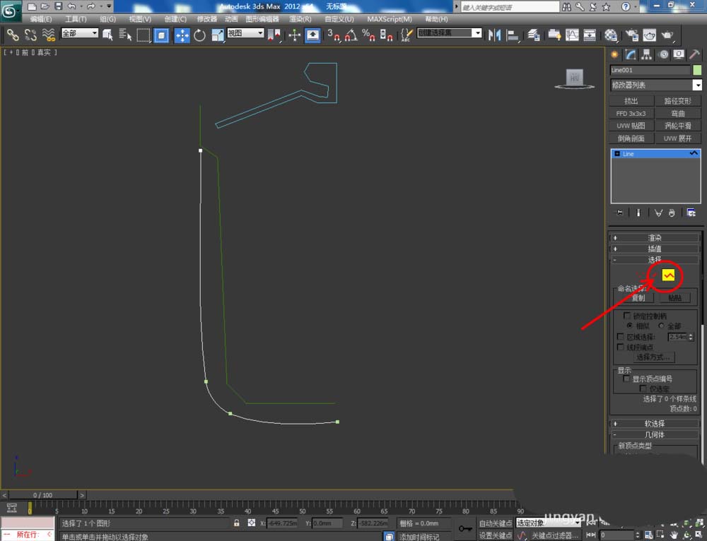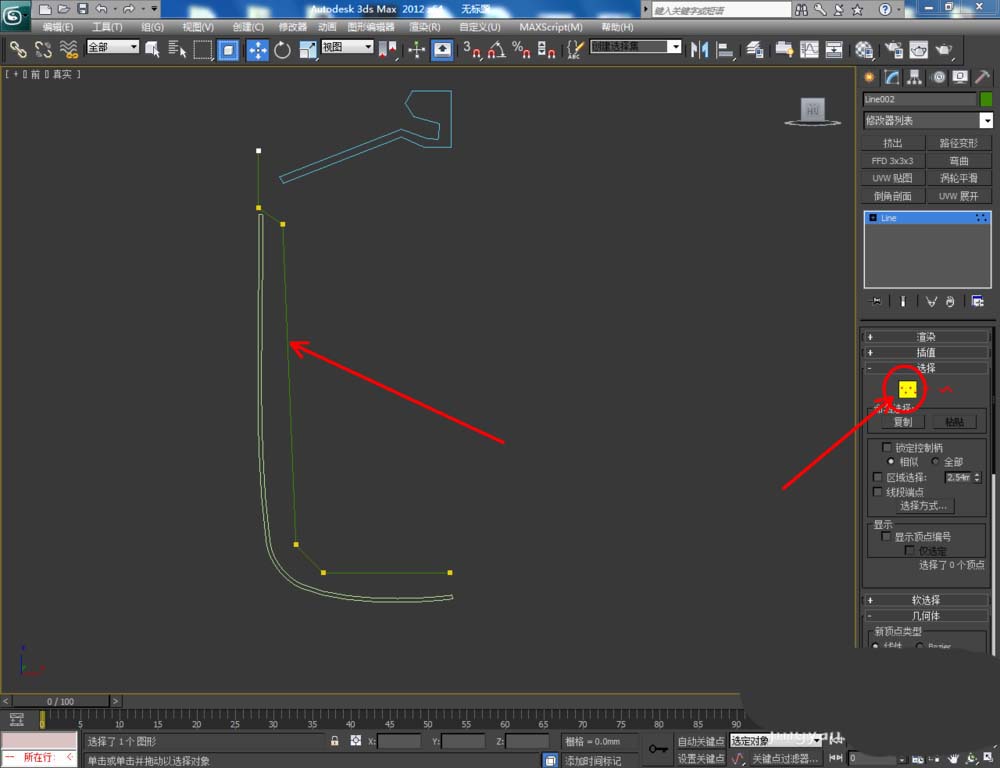 3、选中图案1,点击右边工作区中的【顶点】图标,选中图示图案上的点后进行圆化处理和位置调整。点击【样条线】图标,选中所有样条线后,对其进行轮廓处理(如图所示);
