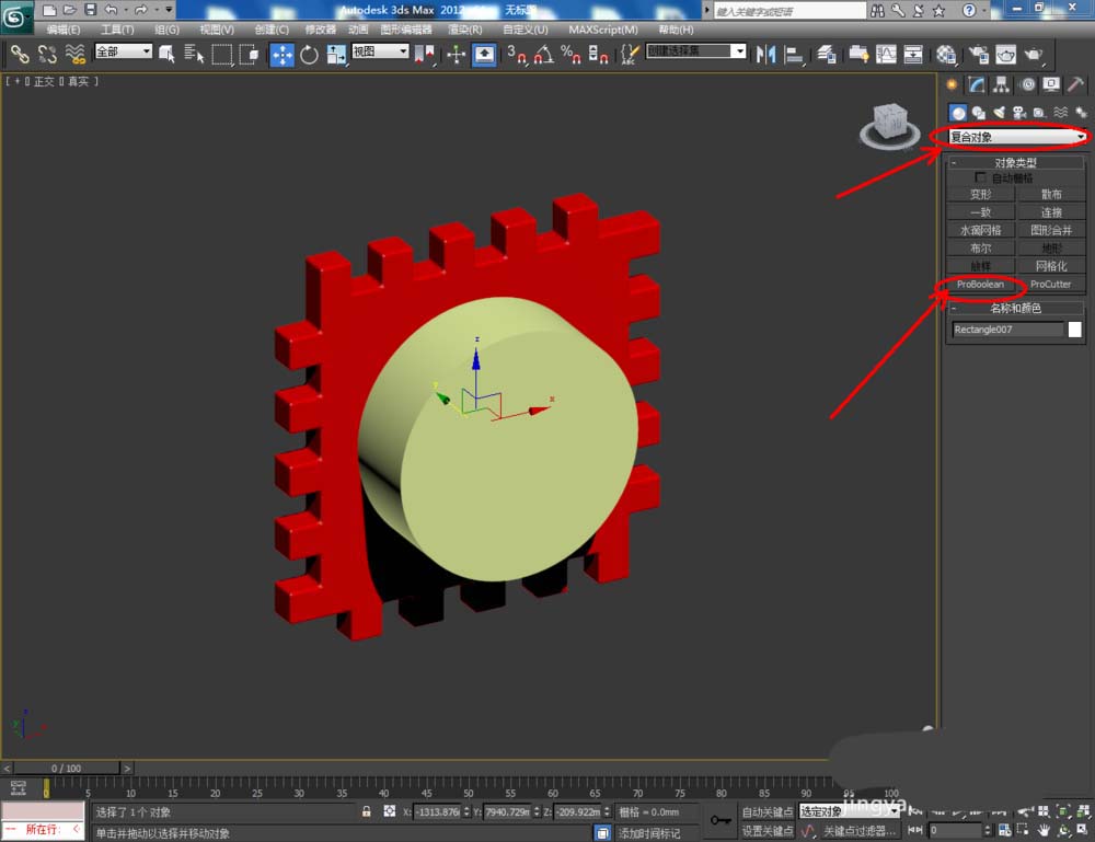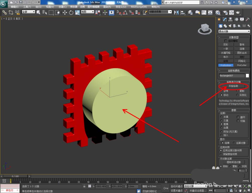 3、选中方形积木模型,点击【创建】-【几何体】-【复合对象】-【ProBoolean】,点击【拾取对象】拾取圆柱体模型,制作出一个带洞口的方形积木模型。完成后,拉动复制出几个模型副本(如图所示);