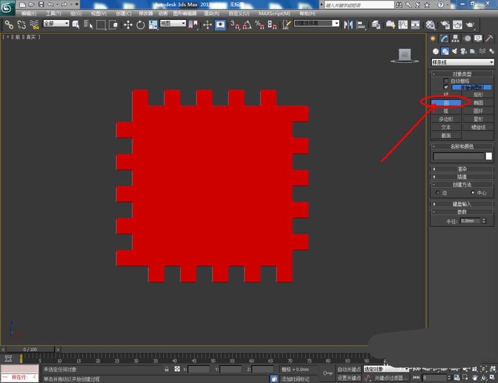 2、拉动复制出一块方形积木模型后,点击【创建】-【图形】-【圆】,在图示位置绘制一个圆形图案。选中图案,点击【修改】-【挤出】并设置好挤出参数,制作出一个辅助圆柱体模型(如图所示);