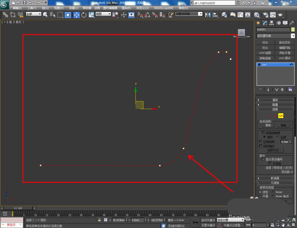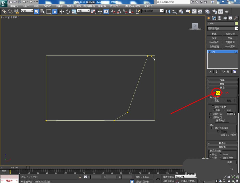 2、点击【创建】-【图形】-【线】,按图示以矩形图案为参考,绘制一个多边图案。点击右边工作区中的【顶点】图标,选中图示图案上的点,将选点进行圆化平滑处理。完成后删除矩形参考图案;