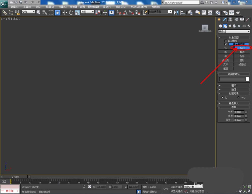 1、打开3Dmax2012软件,点击【创建】-【图形】-【矩形】,在作图区域绘制一个矩形参考图案并按图示设置好矩形图案的各个参数(如图所示);