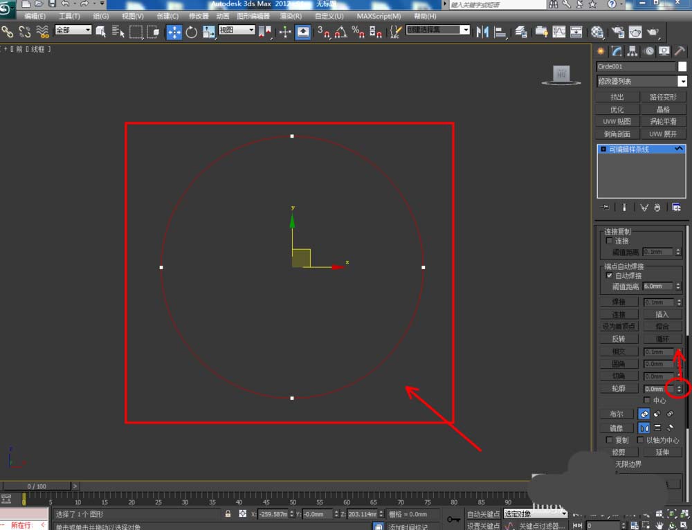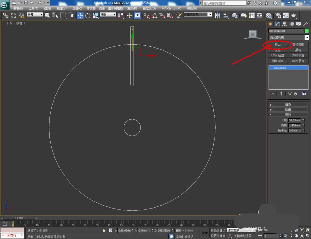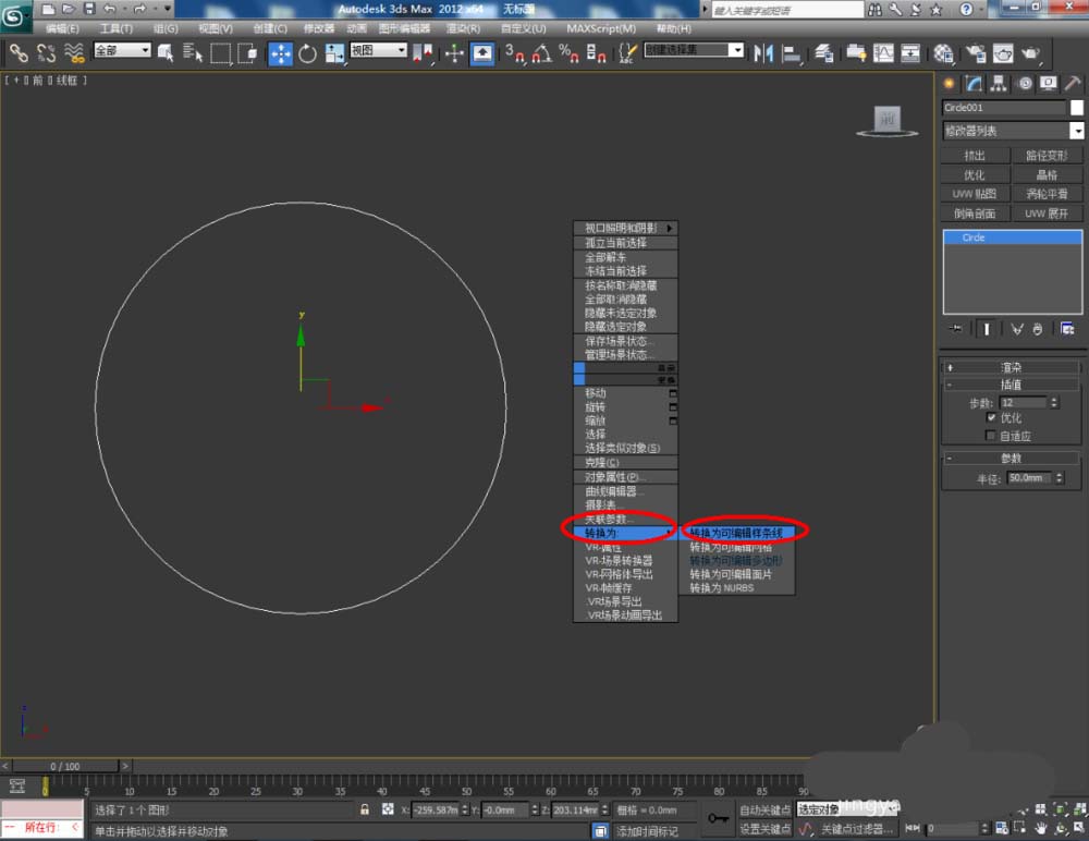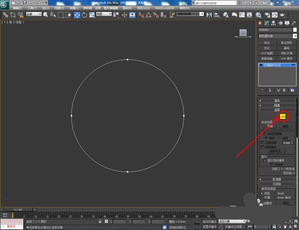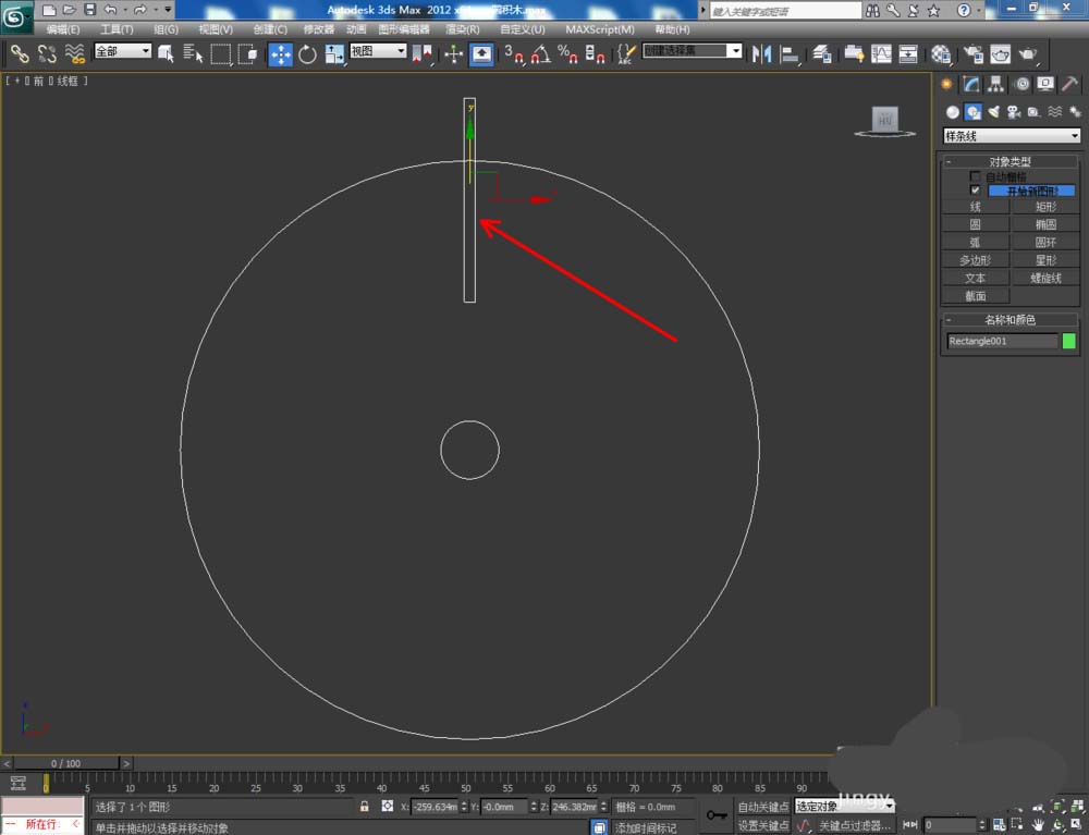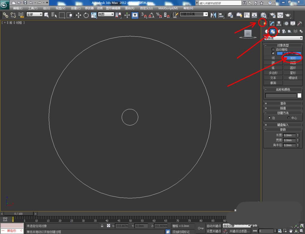 1、打开3Dmax2012软件,点击【创建】-【图形】-【圆形】,在作图区域绘制一个圆形图案并设置好圆形图案的各个参数(如图所示);