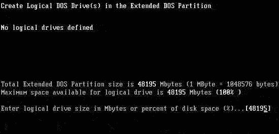 前面提过逻辑分区在扩展分区中划分,在此输入第一个逻辑分区的大小或百分比,最高不超过扩展分区的大小。