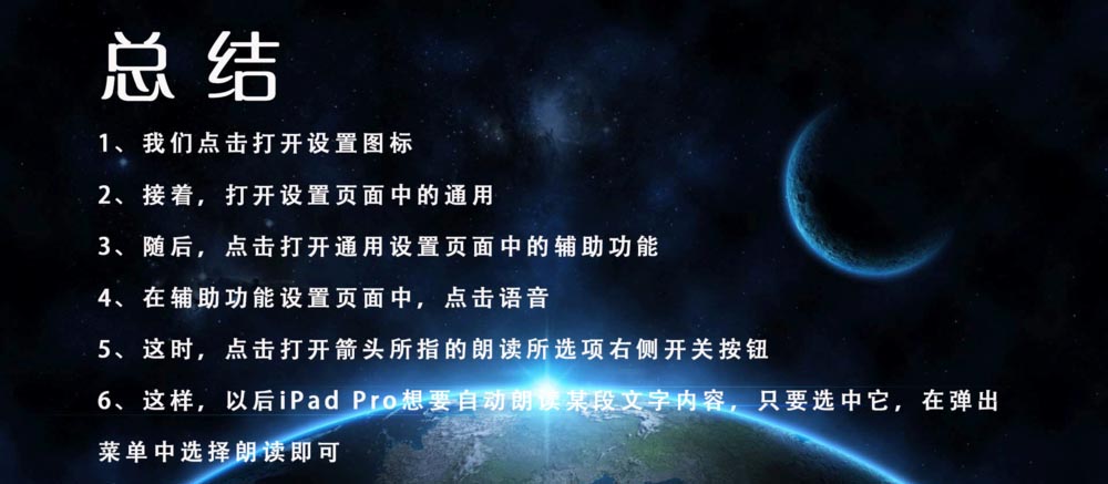 对于一些视力障碍的人群,可以通过iPad Pro平板电脑的朗读功能来进行屏幕文字内容的自动阅读,以达到获取文本信息的目的,该怎么设置苹果iPad Pro选中文本时怎样显示朗读按钮呢?下面我们就来看看详细的教程。