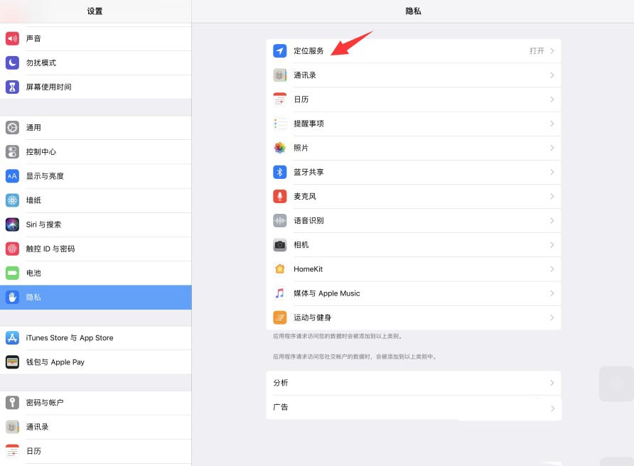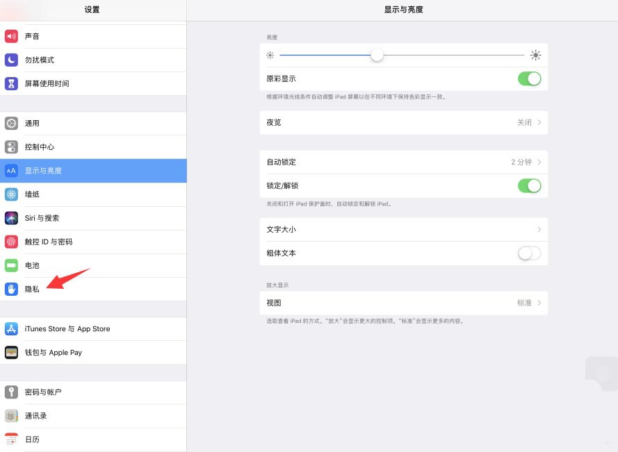 1、我们在iPad Pro平板电脑设置页面中,点击打开隐私选项