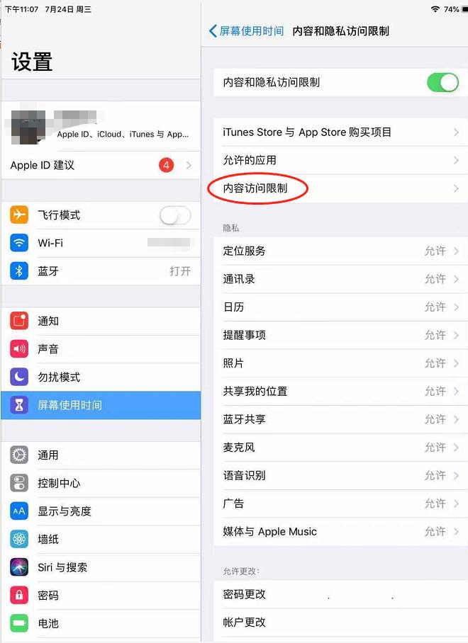 1、打开iPad的设置,点击“屏幕使用时间”-“为屏幕使用时间设置密码”,设置好密码以后,点击“内容和隐私访问限制”;