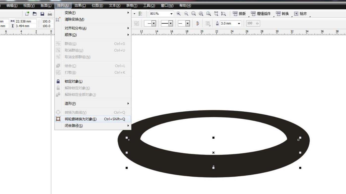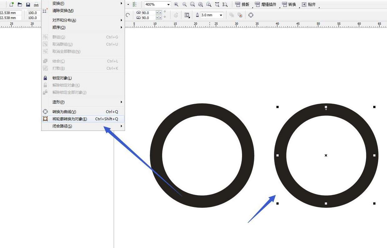 将这个圆环复制一个,向右侧移动,然后点击右键复制,然后将右侧的这个转化为对象