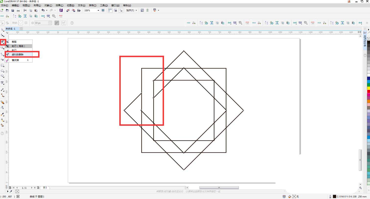 2、选中矩形框按“+”键复制,点击旋转45度,点击虚拟段删除工具删除矩形中重叠的线条。